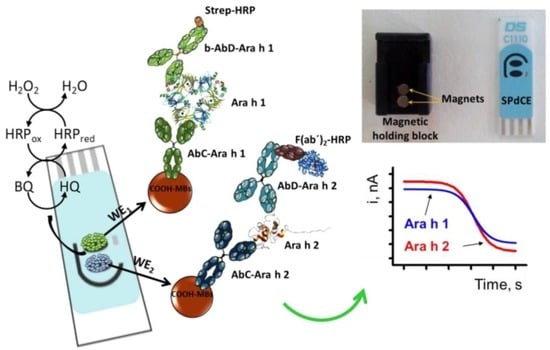 Among various types of nanomaterials that were applied to increase the analytical performance of electrochemical sensors [] and bioassays, magnetic nanoparticles have been largely preferred for functionalization of electrode surface because of their high surface to volume ratio [,], which facilitates quantitative immobilization [,,,,,]. Commercially available magnetic beads (MBs) modified with carboxyl functionalities, streptavidin, protein A or protein G allow different strategies for easy and stable attachment of biomolecules with preservation of their activity and affinity. Modified MBs have also wide applications in analytical separation and concentration of target analytes from complex real samples. Actuation under a magnetic field to concentrate MBs on an electrode surface for performing affinity recognition followed by regeneration of the original surface for the next assay by switching off the magnetic field offer an easy way to improve the specificity and sensitivity of assays and made from electrochemical magnetoimmunoassays a preferred approach for many researchers. Magnetic nanoparticles actuated in magnetic fields can also be used to transport biomolecules at target sites in microfluidics, while selecting an appropriate frequency of actuation can help improve the signal-to-noise ratio of the assays. Overall, magnetic beads proved to be versatile tools for electrochemical biosensing [,,]. Association of screen-printed electrodes for cost-effective, easy detection with magnetic beads functionalized with high affinity, specific antibodies or aptamers delivered an advantageous approach for the detection of various analytes [], including food allergens such as ovalbumin [], β-lactoglobulin [] Ara h 1 and Ara h 2 [] and gluten []. An illustrative example of the potential and advantages of magnetoimmunosensors was provided by Ruiz-Montiel et al. [] for the simultaneous detection of Ara h 1 and Ara h 2 using dual screen-printed electrodes. Sandwich immunoassays were performed onto magnetic beads (MBs), immobilised on electrode surface by positioning a magnet under each electrode. The magnetic beads were modified with antibodies specific for Ara h 1 and Ara h 2, respectively. The allergen proteins were captured by the antibodies and sandwiched between them and detection antibodies added in the solution. To translate allergen binding onto the MBs into an electrochemical signal, the detection antibodies were labelled with horseradish peroxidase (HRP), hydroquinone was added as enzyme substrate and the enzymatic product, benzoquinone was electrochemically detected at the surface of screen-printed electrodes as depicted in Figure 4.