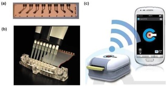 Analytical setup for casein detection including screen-printed electrodes (a), set of 8 electrochemical cells (b) and portable potentiostat controlled by smartphone via Bluetooth (c). Reproduced from [] under the terms and conditions of the Creative Commons Attribution license (http://creativecommons.org/licenses/by/4.0/).
