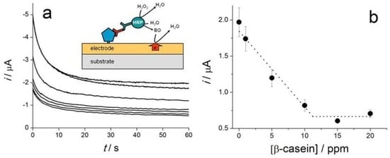 The biosensing principle relies on the competition between casein immobilised on the electrode and that contained in the sample, for anti-casein antibodies added in the sample solution. Translation of casein-antibody binding event into an electrochemical signal that is quantitatively correlated with the amount of casein in the sample was achieved with a secondary antibody labeled with HRP and chronoamperometric detection of benzoquinone formed in the enzymatic reaction. The intensity of the current recorded 60 s after applying the potential was taken as analytical signal used to build the calibration curve (Figure 6a,b).