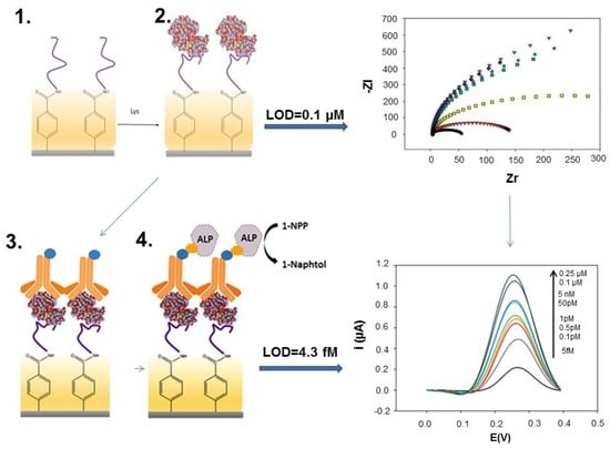 Illustration of two configurations used in screen-printed aptasensors for lysozyme analysis in wine. Steps 1 and 2 depict the construction of an impedimetric aptasensor where a biotinylated aptamer is covalently immobilized on a carboxyl-functionalized surface (1). Lysozyme binding (2) is detected directly by EIS. In a second assay, a biotinylated antibody is added after lysozyme binding (3), this detection antibody is labeled with streptavidin-alkaline phosphatase conjugate (ALP), the enzyme substrate, 1-naphtyl phosphate (1-NPP) is added (4) and the enzymatic product 1-naphtol is detected by DPV. Introduction of steps 3 and 4 and detection by DPV allowed improving the detection limit from 0.1 µM to 4.3 fM. Adapted from [] and [] with permission.
