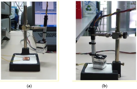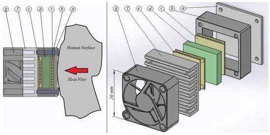 The thermostat comprised a small (10 × 12 × 3 mm3) aluminium block (Part d in Figure 1) containing a heating resistor (R = 16.74 Ω) and an RTD sensor (1PT100KN1515, Omega, Manchester, UK). The thermostat also included a cooling system (Parts e, f and g in Figure 1) based around a thermopile (HOT20-65-F2A, Laird, London, UK, 13.2 × 13.2 × 2.2 mm3), which absorbed heat from the thermostat through the Peltier effect, and an aluminium heat sink (with its corresponding fan) attached to the cooling thermopile’s hot surface.