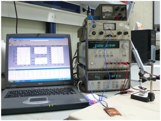 The experimental setup also included a third power supply to run another resistor placed on the laboratory bench. This additional resistor was located underneath a copper plate with a larger surface area (60 × 35 mm2) than the sensor (20 × 20 mm2) and was used to simulate a measurement made on the surface of the human body (see Figure 3).