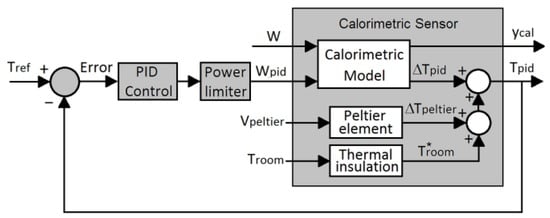 To explain how the sensor works, Figure 4 is a block diagram where each block represents a different part of the device and features its corresponding input and output variables. The diagram includes the temperature control loop for the thermostat, where Tref is the desired thermostat temperature and Tpid is the thermostat’s actual temperature. The PID controller was used to calculate the power Wpid dissipated in the thermostat according to the following equation: