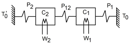 where Ki is the sensitivity or steady-state response to a unit step, and τi = −1/si and τi* = −1/si* (si represents the poles and si* the zeros for each TFi). This is equivalent to a total of four parameters for each TFi; if we force all the TFi to take the same pole, this will give a total of 10 parameters. To further reduce the number of parameters, we selected a model based on what is known as the localised-constant model, a model widely used in calorimetry [,,,]. Taking into account that the calorimetric signal depends on the temperature recorded on each surface of the measurement thermopile, we can consider two separate bodies with these temperatures. Hence, the first body represents the domain encompassing the dissipation site and one of the thermopile’s surfaces, while the second body represents the domain formed by the thermostat and the other side of the thermopile. Each body was assumed to have an infinite thermal conductivity and heat capacity Ci. In addition, each body was connected to the other and to the exterior using thermal couplings with a thermal conductivity of Pik (see Figure 5).