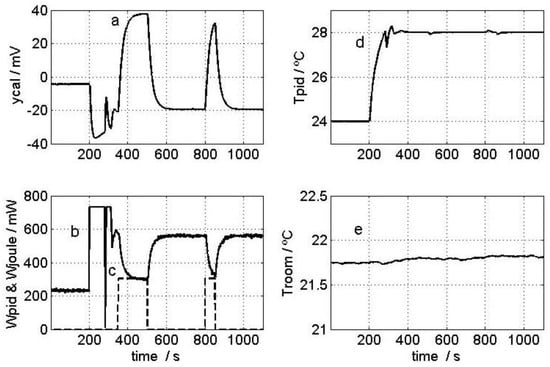 Input and output curves used in the calibration: (a) Calorimetric signal; (b) Power dissipated in the thermostat resistor; (c) Power dissipated into the calibration base by the Joule effect; (d) Thermostat temperature; and (e) Room temperature.