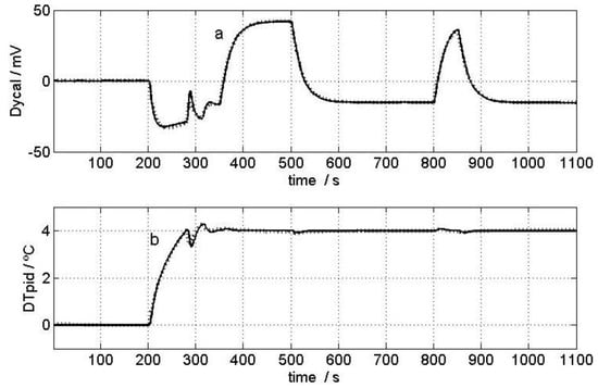 The third sub-block is the calorimetric model. Its inputs were the powers passing across the sensor (W) and dissipated in the thermostat (Wpid), while the outputs were the calorimetric signals taken from the measurement thermopile (ycal) and any fluctuations recorded in the thermostat’s actual temperature (ΔTpid). Therefore, it is a multiple-input, multiple-output (MIMO) system.