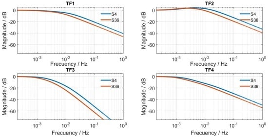 The four TFi have the same poles, but different sensitivities and zeros. With this approach we managed to reduce the number of model parameters to just six: C1, C2, P1, P12, P2 and k. The sensitivities, poles and zeros for each TFi were calculated from these parameters using Equation (10).