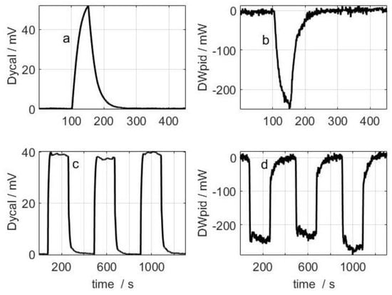 Measurement performed on the calibration base: (a) calorimetric signal; and (b) power dissipated in the thermostat. Measurement performed on the large resistor placed on the laboratory workbench: (c) calorimetric signal; and (d) power dissipated in the thermostat. The baseline was corrected for the four curves displayed.