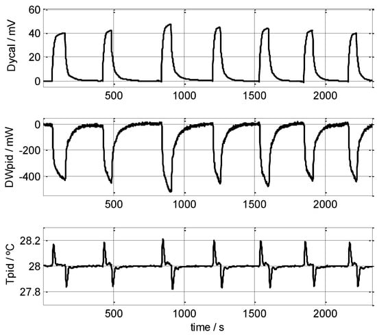 Consecutive measurements made on the left wrist of a healthy, 58-year-old male subject. Calculated mean powers: 147, 162, 173, 177, 167, 162 and 150 mW (162 ± 15 mW), at Troom = 21 °C, Tpid = 28 °C. The baselines of the curves for the calorimetric signal and the thermostat’s power were corrected. Thermostat temperature is also shown (Tpid). VPeltier = 0.2 V.