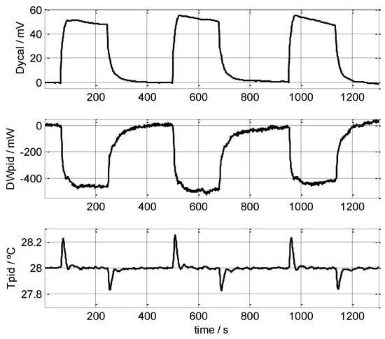 Three consecutive measurements made on the left wrist of a healthy, 22-year-old male subject. Calculated mean powers: 199, 214 and 219 mW (209 ± 10 mW) at Troom = 21.4 °C, Tpid = 28.0 °C. The baselines of the curves for the calorimetric signal and the thermostat’s power were corrected. Thermostat temperature is also shown (Tpid). VPeltier = 0.2 V.