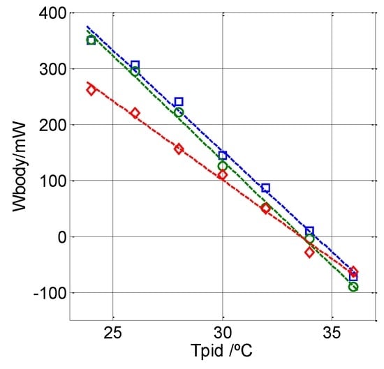 We also included in this work measurements of the left wrist of a healthy 58-year-old male at different thermostat temperatures ranging from 24 °C to 36 °C and at an ambient temperature of 26 °C. Figure 13 shows three sets of measurements made on three different days. Each series consists of seven consecutive measurements, one for each thermostat temperature. The values obtained can be linearly adjusted, the place the slope cuts the horizontal axis depends on the physical and/or emotional state of the subject.