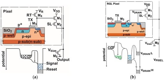 Two types of active pixel sensors (APSs), as shown in Figure 1, are used here for realizing ultra-low-noise CISs together with high-gain column readout circuits. One (Figure 1a) is the well-known APS with four transistors for a source follower (M1), pixel selection (M2), charge transfer (M3), and charge resetting (M4). The other (Figure 1b) is a special type of APS for higher conversion gain with three transistors and a reset-gateless (RGL) charge resetting technique [,]. Both pixels use a pinned photodiode for low dark current and signal readout with perfect charge transfer. In Figure 1a, the size of transistors, wiring, and size of floating diffusion (FD) are carefully designed to minimize the parasitic capacitance of the floating diffusion node and maximize the conversion gain. In Figure 1b, a very high conversion gain is expected because of small parasitic capacitance at the FD node not only by optimizing transistor size and wiring, but also by using a structure to reduce parasitic capacitance due to transistors. To reduce the capacitance from the gate of M3 to FD, a depleted potential saddle is created between the transfer gate and the FD []. To eliminate the capacitance of the reset transistor, the reset transistor is removed and the resetting of charge in the FD is done by pulling the drain junction to a very high level.