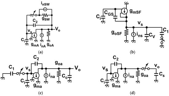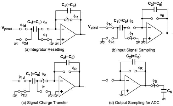 During the signal readout process from the pixel output sampling to A/D conversion, the readout circuits’ noise is superimposed on the photo signal at each phase of operation of the CMS readout circuits. The equivalent circuits for noise calculation at each phase of Figure 3 are shown in Figure 7.