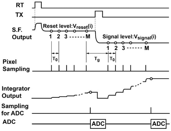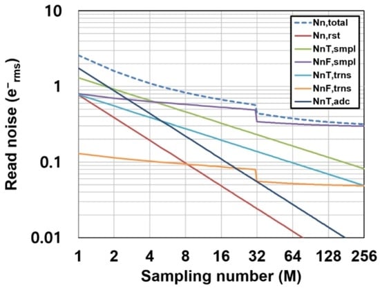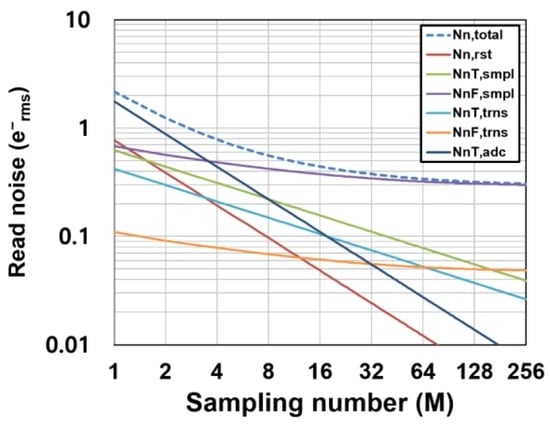 Since the introduction of the concept of active-pixel CMOS image sensors (CISs) using in-pixel charge transfer [,], CISs have been recognized as image sensors suitable for low-light level imaging, and the introduction of pinned photodiodes in four-transistor (4T) active-pixel CISs has enabled overall image quality control for low-light-level imaging, including those for low dark current, fewer white defects, and no image lag [,,]. Since the read noise performance of CISs is determined by many factors which are controlled by process, device, and circuit technologies, the read noise of CISs with pinned photodiodes is gradually reduced in the past twenty years as new techniques and technologies are introduced. In the CIS with pinned photodiodes reported in 2001, the read noise was 13.5 e− []. Several CISs with sub-electron [,,] and deep sub-electron noise [,,] levels have been reported recently, and the best noise level has reached below 0.3 e− [,,]. In an active pixel device called DEPFET with non-destructive multiple readouts of the pixel output, very low noise level of 0.25 e− [] and 0.18 e− [] have been attained. Roughly speaking, the read noise of CISs is reduced down to one-fiftieth in the past 15 years. High conversion gain is definitely the most important factor for realizing the low read noise. However, a deep sub-electron noise level is not realized without the help of readout-circuit techniques with a high noise reduction capability. For instance, a column high-gain pre-amplifier before an analog serial readout or a column analog-to-digital conversion (ADC) is an effective technique for low-noise CISs [,,]. A very low noise level of 1.5 e−rms is demonstrated in a pinned-photodiode CIS using a high-gain (gain = 32) column amplifier []. For further efficient noise reduction, high-gain pre-amplification using multiple sampling of the pixel output is becoming another important technique for low-noise CISs. A multiple sampling technique known as Fowler sampling is used for reading, non-destructively, the outputs of infrared light image sensors [], and a technique called multiple correlated double sampling (MCDS) [], or correlated multiple sampling (CMS), is used for a pixel detector for high-energy particles [] and column readout circuits for low-noise CISs [,,]. The authors have recently applied this technique to an experimental image sensor using high-conversion gain pixels and a large sampling number of 128, and deep sub-electron noise level of 0.27 e−rms has been attained [].