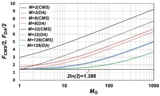 The factor of the 1/f noise reduction for the CMS for a large M becomes almost the same as that for the case of the noise reduction technique called the differential averager using continuous integration []. The ratio of MG to M is denoted by RG, i.e., . Then the noise reduction factor of the CMS can be approximated by a noise reduction factor of the differential averager FDA, which is a function of RG only and is given by []: