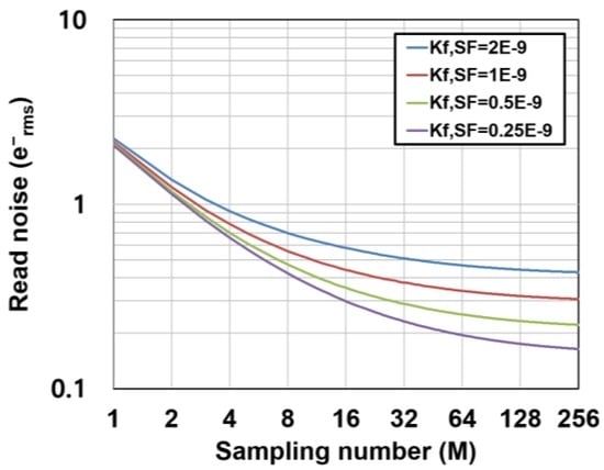Very high conversion gains of 220 μV/e− and 135 μV/e− are assumed for the RGL and 4T pixels, respectively, in order to compare with the experimental results described in Section 4. A MG of 16 is assumed. As shown in Figure 9, for the low-gain region (M: 1–4), the read noise is determined by the ADC noise. This component rapidly decreases by increasing M as a function of 1/M. In the medium-gain region (M: 4–16), the noise is dominated by the mixture of noise components including the thermal noise components. For the high-gain region (M: larger than 32), the read noise is dominated by the 1/f noise of the pixel source follower, and because the 1/f noise component has a slight dependency on M for a large M, the read noise approaches to the lowest limit of noise reduction. The achievable noise level for a large M depends on the 1/f noise performance of the pixel source follower which is determined by the fabrication process technology and the conversion gain. A deep sub-electron noise level can be realized if a pixel with low 1/f noise devices and high conversion gain is available. Figure 10 shows the calculated total read noise as a function of M and for different 1/f noise parameters of the pixel source follower. If the target noise level is 0.2 e−rms, a very high CMS gain (M > 64) and a low 1/f noise transistor (Kf < 0.25 × 10−9 [V2]) is necessary if the conversion gain is unchanged for maintaining the signal dynamic range.