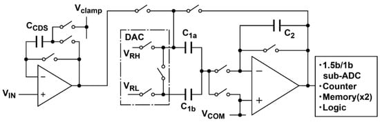 The noise analysis given in Section 3 is based on a simplified and more general type of the CMS readout circuits. This simplified analysis is useful for understanding the contribution of noise components at different gain settings of the CMS. To compare the noise measurement results and the noise calculated for the readout circuits actually implemented a few modifications to the noise model are necessary. In the actual implementation, an analog CDS circuit is used in front of the column ADC, as shown in Figure 12. This is for clamping the pedestal level (or reset level) to a fixed voltage level, which is close to the bottom reference level of the ADC to maximize the available voltage range. The reset noise is generated in the analog CDS circuits, but it is cancelled by the final digital CDS operation in the digital domain []. The CMS circuits actually used are implemented as a folding integration ADC, of which the analog core is also used for the cascaded A/D conversion using the cyclic ADC, as shown in Figure 12. To include the noise due to the analog CDS circuit, and the influence of the noise increase due to another sampling capacitor C1b, the thermal noises in the input sampling phase and charge transfer phase given by Equations (15) and (26), respectively, are modified as: