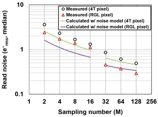 As shown in Figure 15 and Table 2, MG for low gain (M = 2, 4, 8, and 16) is set to large values of more than 200. This causes a lesser 1/f noise reduction effect, as explained in Equation (17). For high gain (M = 32, 64, and 128), MG of 16 is used, and a high 1/f noise reduction effect is expected. The CMS effectively reduces the noise (median) from 3.7 e− to 0.5 e− for the 4T pixel, and 2.3 e− to 0.29 e− for the RGL pixel, respectively, by increasing the gain from two to 128. The noise calculated with the proposed model does not perfectly explain the experimental results, particularly at the low CMS gain. Since the 1/f noise suppression capability of the CMS can be degraded by increasing the time from reset to signal samples, and the noise of the small-size transistors in the pixels does not always take the exact 1/f noise spectrum. These can make the difference between the simulation and measurement. Another possible reason is that the noise of the cyclic ADC is not exactly modeled and other noise components, such as the noise from power supply lines of the substrate, are not included in the noise model. Such noises from power lines of the substrate are often generated due to on-chip digital switching or clocking circuits. Since these noises are not uniform in time, the irregular dependency of the noise reduction to the sampling number of the CMS, or the difference of the calculation and measurement results is likely explained. The measurement results show that the read noise can be further reduced by increasing the CMS gain. This larger dependency of the noise reduction to the CMS gain at high gain (M = 32, 64, and 128) when compared to the theoretical estimation is not clear, but is possibly due to the influence of the additional thermal noise components, which are not modeled in the theory, or RTS (random telegraph signal)-like noise of the in-pixel source follower. The RTS noise or RTS-like noise has a Lorentzian spectrum, or a mixture of Lorentzian spectra and the noise with such a spectrum can be reduced by band-width reduction using a higher CMS gain. The noise of the majority of pixels may take the spectrum of RTS-like noise, not that of the 1/f noise.