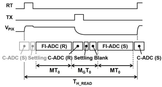 A column readout circuit using multiple sampling is shown in Figure 2. The column correlated multiple sampling (CMS) is implemented with a switched-capacitor (SC) integrator. The operation phase diagram and timing diagram of the column CMS circuits are shown in Figure 3 and Figure 4, respectively. At the beginning, the capacitor C2 of the integrator is reset by turning the on switch controlled by φR as shown in Figure 3a, while the RT in the pixel in the case of the 4T pixel is set to high for resetting the FD node of the pixel. Then, for multiple sampling of the reset level, the pixel output is sampled by the capacitor C1 with switches controlled by φ1 and φ1d as shown in Figure 3b and the charge in C1 is transferred to C2 as shown in Figure 3c by turning switches controlled by φ2 and φ2d on. By repeating this operation of Figure 3b,c M times, the M samples of the reset level are integrated over in the integrator. The resulting output of the integrator after M-time sampling is given by , where is the average of the reset level of the pixel output and is the gain of the integration in one cycle. This integrator output is sampled by a sample-and-hold capacitor and converted to an n-bit digital code by the n-bit column ADC. Similarly, after the charge transfer from the photodiode (PD) to FD by opening the charge transfer (TX) gate, the photo-signal level of the pixel output is sampled M times and the M samples are integrated over in the integrator. The resulting output after M-time sampling is given by , where is the average of the photo-signal level of the pixel output. This integrator output is also sampled by a sample-and-hold capacitor and converted to an n-bit digital code by the n-bit column ADC. After the A/D conversion of the integrator output for the reset and photo-signal levels, the difference of those stored in two n-bit memories for reset and signal levels is taken in the digital domain to perform the correlated double sampling (CDS) for cancelling the pixel fixed pattern noise (FPN) and reset noise. This CMS processing, which is a combination of M-time sampling and integration in the analog domain, and the CDS in digital domain, has high suppression effects of thermal and 1/f noise and a strong effect of cancelling vertical FPN (VFPN) of CISs, which is caused by the offset deviation of the column readout circuits. The sampling number of the readout circuits based on the CMS technique should be carefully chosen by their applications, e.g., the sensor operations can be determined by following the desired capabilities for applications: (1) high sensitivity with a relatively low frame rate; and (2) high operation speed with an allowable noise level.
