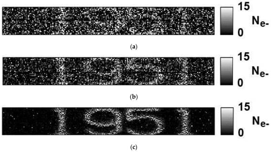 In order to demonstrate the noise reduction effect of CMS in the deep sub-electron region, sample images are taken by three different CMS gains of two, 16, and 128, as shown in Figure 16. With these three gains of two, 16, and 128, the noise levels (median) of 2.4 e−rms, 1.1 e−rms, and 0.29 e−rms, respectively, have been obtained. The character code of “1951” in a part of the USAF (United State Air Force) test chart is used for this imaging test of three different low-noise levels and small signal photoelectron number of less than ten. When compared to the image with the noise level of 1.1 e−rms, which is the best noise level of commercially available very-low-noise CISs, the image with the noise level of 0.29 e−rms has advantages in image contrast and recognizability of the character code. In the image with the noise level of 2.4 e−rms, it is hard to recognize the character code without prior knowledge that the character code is “1951”.
