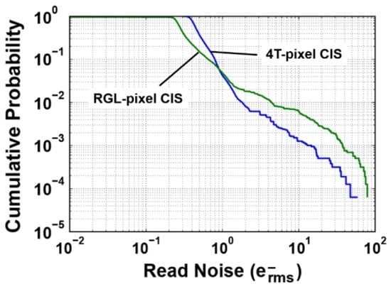 In Figure 17, the cumulative probability plot of noise for the RGL-pixel CIS and 4T-pixel CIS is shown. The CMS gain (M) of 128 is used. The transistor size of the in-pixel source follower of the RGL pixel is 0.325 mm × 0.345 mm, and that of the 4T pixel is 0.7 μm × 0.9 μm. Due to the small gate area of the in-pixel source follower transistor of the RGL pixel, the population of noisy pixels with greater than 1 e− is higher than that of the 4T-pixel CIS [].