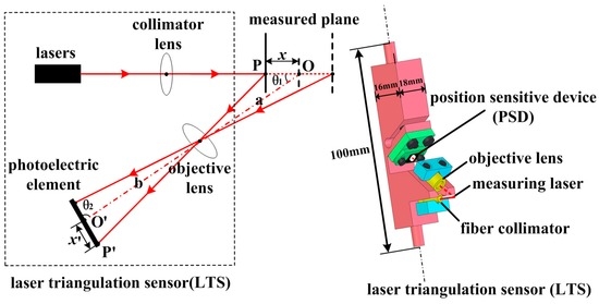 Laser triangulation sensors (LTSs) have the advantage of wide measuring range and high accuracy, and are commonly used in dimensional metrology (in addition to reverse engineering applications). A LTS is mainly composed of two sub-systems: one is the laser emitting system, which employs a semiconductor laser; and the other is the laser receiving system, which employs a photoelectric element. The principle of LTS is shown in Figure 1. The incident laser goes through collimator lens and points at the measured object. The reflected light spreads through objective lens and focuses on the photoelectric element. When the laser spot moves from point P to point O, the corresponding image spot follows from point P′ to point O′. The displacement relationship between the laser point and corresponding image spot is determined by