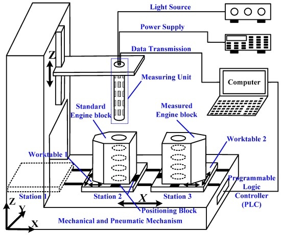 The high-speed, automatic measuring system for shaft holes inside engine block, as shown in Figure 2, mainly consists of the mechanical and pneumatic mechanism, a measuring unit, data processing system, and standard and measured workpieces. This measuring system is specially designed for the 4 H engine block by Dongfeng Motor Co., Ltd., in which five-layer shaft holes needs to be measured. Nevertheless, the system design and proposed measuring method can also be applied to other models of engine blocks by simply replacing this measuring unit with another suitable one.
