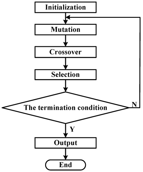 DE algorithm, proposed by Storn and Price [25], is successfully applied to solve numerous optimization problems in diverse fields. It offers great flexibility, robustness and precision with respect to various types of functions. The performance of DE algorithm mainly depends on three control parameters (mutation control parameter F, crossover control parameter Cr, and population size Np) and two algorithm strategies (mutation strategy and crossover strategy). JADE improves the optimization performance of DE by implementing a new mutation strategy and updating control parameters in an adaptive manner [27]. The principle of JADE algorithm, as shown in Figure 7, can be described as follows: