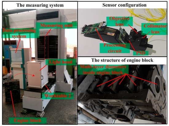 The online measuring system for shaft holes inside engine block is shown in Figure 9. The measured workpiece is the 4 H engine block by Dongfeng Motor Co., Ltd. The light hood above the measured workpiece is to eliminate the interference caused by ambient light. The LTSs used in the measuring system are developed by ourselves. The measuring range of developed LTSs is 1.5 mm while their measuring accuracy is within 1 μm, and the stand-off distance is 0.5 mm. All the sensors’ triangulation angles are about 25°. The PSDs used in the developed LTSs are S4584-06 of Hamamatsu Photonics (Japan). The semiconductor lasers are MQW F-P LD of Rayscience Optoelectronic Innovation (China). The size of objective lens is Φ6 mm × 14 mm. Its object distance is 8.63 mm while its image distance is 9.97 mm. The software used for data processing is written in VC++2008 and runs on a computer with an Intel Core I7 3970 K 3.5 GHz and 8 GB RAM. The measurement procedure is described as follows: