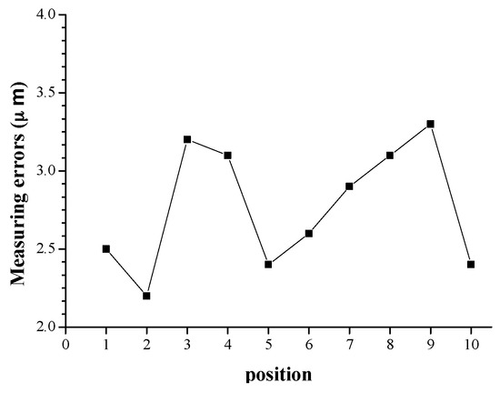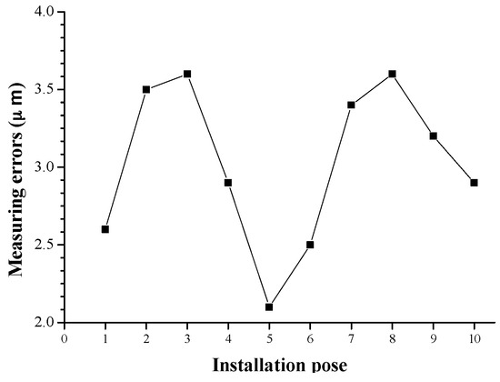 As analyzed in Section 4.1, the measuring unit’s installation pose and its measuring position do not impact the measuring results. This is the basis to perform fast and automatic measurement. To validate this, the engine block is firstly measured at 10 different positions, and then measured at 10 different installation poses, and the measuring results are shown in Figure 10 and Figure 11, respectively. From Figure 10 and Figure 11, it is observed that the measuring errors are all in the range from 2 μm to 4 μm, and the results coincide with the data in Table 2, Table 3 and Table 4. Consequently, it can be concluded that the measuring unit’s installation pose and measuring position do not have obvious influence on the measuring accuracy.