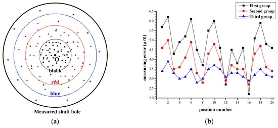 Another relevant factor that may affect the measuring accuracy is calibration data. Measuring data for calibration have vital effect on estimate values of the intrinsic parameters. Furthermore, the intrinsic parameters would affect the final measuring results. To intuitively illustrate this relationship, different data samples are employed in parameter estimation. In Figure 12a, O is the shaft axis of measured shaft hole. The other points in color are the shaft axis of the measuring module. Hence, the position relationship between the measured shaft hole and the measuring module can be deemed as the relative position between point O and the points in color. The points in black are the positions of the measuring module where we get the first sets of calibration data. The points in red are the measuring module’s positions where we acquire the second sets of calibration data. The points in blue are the positions where to obtain the third sets of calibration data. In calibration process, each set of calibration data are acquired from 30 measurements. These measurements are approximately uniformly distributed around the shaft axis of shaft hole. Three groups of intrinsic parameters can be calculated according to three sets of calibration data. To test the influence of calibration data to measuring accuracy, the engine block is measured at diverse positions using the intrinsic parameters above. The points in green are the measuring module’s positions during measurement process. The measuring errors in Figure 12b clearly illustrate that calibration data have a visible impact on the measuring accuracy. The bigger range calibration data are in (Figure 12a), the higher accuracy we can achieve (Figure 12b). Therefore, calibration data should cover their feasible ranges and better meet uniformly distributed. This conclusion is consistent with what we mentioned in Section 4.2.
