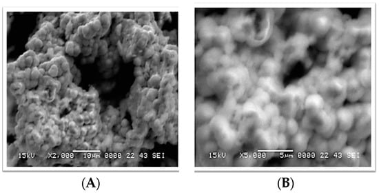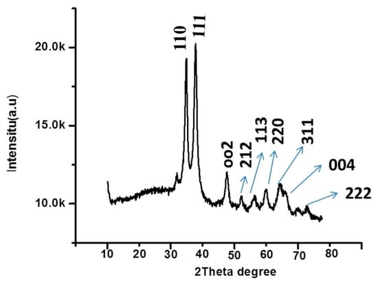 Figure 1 depicts the measured XRD patterns of the synthesized CuO nanostructures. The diffraction peaks around (110), (111), (002), (212), (113), (220), (311), (004), and (222) were assigned to the pure monoclinic phase of CuO (JCPDS Card No. 45-0937). The prepared CuO nanomaterial was determined to be of high purity and excellent crystalline quality. Figure 2 shows the SEM images of the CuO nanostructures obtained using lysine as a soft template. The exhibited morphology was that of a cotton flower at low and high magnification (Figure 2A,B, respectively). The lysine played a crucial role in tuning the morphology of CuO nanostructures by controlling the dimensions and features.
