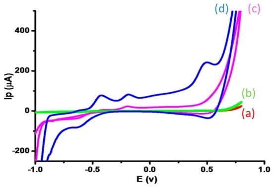 Cyclic voltammograms recorded in 0.1 M NaOH in either (a) the absence of glucose or (b) the presence of 1 mM glucose with a bare GCE; and CuO-nanostructure-modified GCEs in either (c) the absence of glucose or (d) the presence of 1 mM glucose. Scan rates are 0.05 mV·s−1.