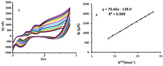 (A) Cyclic voltammograms obtained with CuO-nanostructure-modified GCEs in 0.1 M NaOH and 1 mM glucose at various scan rates (150, 200, 300, 400, 500, 600, 700, 800, 900 and 1000 mV·s−1; (B) The inset shows the plot of Ip versus the square root of the scan rate.