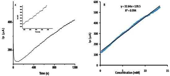 Amperometry was used to estimate the sensing potential of the electrode modified with newly prepared CuO nanostructures with successive glucose additions in 0.1 M NaOH at an applied potential of +0.5 V (Figure 5A). The solution was stirred continuously. With the addition of glucose, the modified electrode showed rapid and sensitive responses, achieving 90% of the steady-state current within a short interval of time (5 s). The amperometric responses were repeated in triplicate, and the average response was used for the linear range calibration curve (Figure 5B). Calibration curve currents increased with each successive addition of higher glucose concentrations in the linear range of 1 to 10 mM. Greater glucose concentrations saturated the active sites of the CuO nanostructures and thus saturated the current response. The modified electrode sensitivity was found to be 464,285.7 μA·mM−1·cm−2, which was estimated from the calibration curve to be in the range of 0.25 mM to 13.25 mM (R2 = 0.99) and the lower limit of detection was determined (0.0159 mM) for glucose sensing (S/N = 3). The sensitivity of the glucose sensor was calculated by dividing the slope of the calibration curve by the sensing area of the electrode. The high sensitivity and wide linear range was attributed to the high surface-to-volume ratio and the excellent efficiency with which the synthesized CuO nanostructures promoted electron transfer between glucose and the working electrode. Compared to reported enzyme-free sensors based on CuO nanostructures modified electrode, our glucose sensor showed excellent performance in a wide linear detection range (Table 1) [,,,].