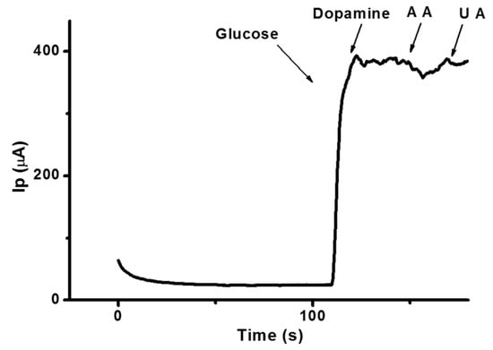 Amperometric current-time response curves for the sequential addition of 0.1 mM aliquots of glucose, dopamine, ascorbic acid, and uric acid.