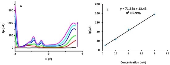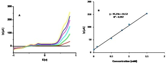 (A) Differential pulse voltammograms for different glucose concentrations (0.1 mM, 0.5 mM, 1 mM, 2 mM, and 2.5 mM); (B) A calibration plot of Ip versus glucose concentration.