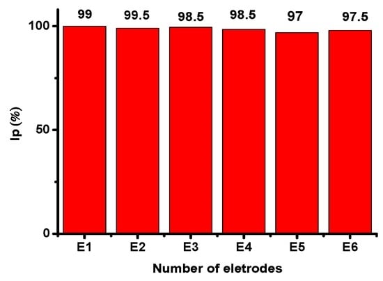 The lifetime usability of our developed glucose sensor was monitored by storing the modified electrodes in air under ambient environmental conditions and intermittently measuring the current response during glucose oxidation. The modified electrode was found to retain approximately 98% of the initial current response after a 2-month storage period. Additionally, six modified electrodes were scanned using CV (50 mV/s) in the presence of 0.5 mM glucose to evaluate the glucose sensor reproducibility under similar conditions (Figure 9). The peak currents from CV calibration plot responses from all electrodes were of similar amplitudes, with a low standard deviation (RSD; 3%), indicating that the fabricated glucose sensors were highly reproducible. The potential stability and reproducibility of the modified electrode were indexed to the high chemical stability of the CuO nanostructures synthesized in this study.