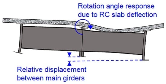 Example of the rotation angle response due to reinforced concrete (RC) slab deflection and relative displacement between main girders.