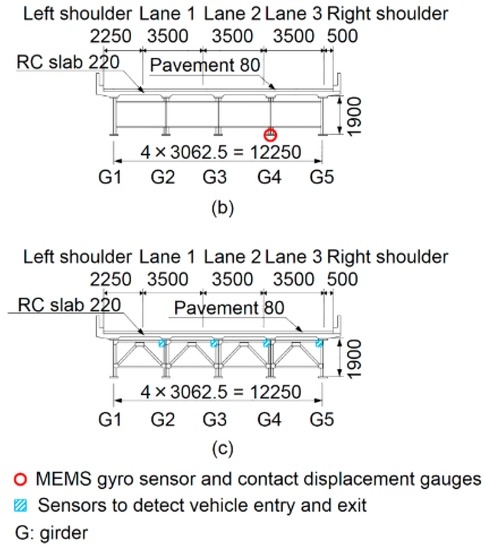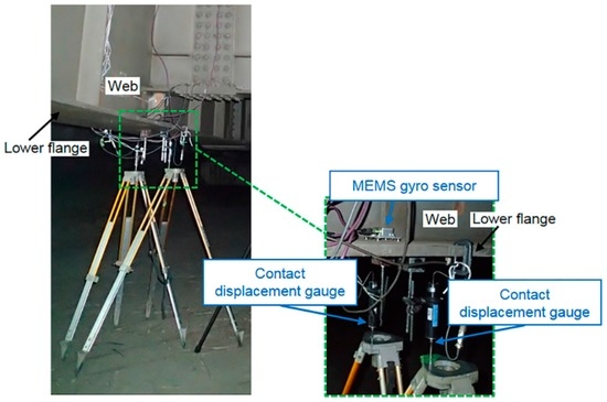 In order to monitor bridge deformations against actual traffic loads, bridge displacement measurements are essential, and many studies have explored methods for conducting such measurements using accelerometers [17,18,19,20,21]. However, in order to accurately monitor bridge deformation against traffic loads, it is necessary not only to measure the bridge displacement response, but also to measure the bridge rotation angle response. If a bridge structure is composed of only one material, the bridge rotation angle response can be approximately extrapolated from the displacement responses at multiple points. However, in a mixed structure, such as a steel-concrete girder bridge, it is difficult to extrapolate the bridge rotation at the joints between an upper flange and an RC deck using the displacement responses measured at that location because of differences between the stiffness of steel and RC. Therefore, the rotation angle response at joints composed of different materials should be measured at a point where we want to obtain rotation angle response data.