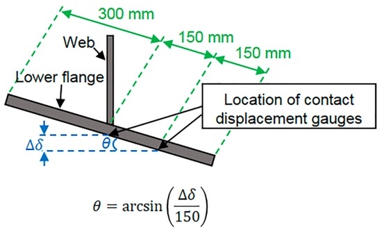 We began by installing a MEMS IMU at the longitudinal center of the lower flange of G4 using a magnet. Two contact displacement gauges were also fixed at the same location in order to verify the accuracy of the rotation angle values obtained from the measured angular velocity. This experimental setup is shown in Figure 4. The method used to determine the bridge rotation angle values from the contact displacement gauge responses is shown in Figure 5.