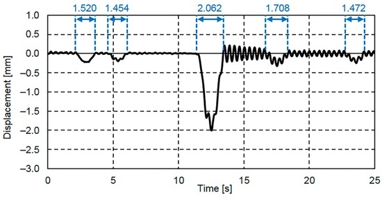 The 25 s displacement response measured by the contact displacement gauges at the lower flange center of G4 is shown in Figure 7. In order to eliminate any effects other than the displacement response, Figure 7 shows the displacement response obtained after the application of a 10 Hz low-pass filter, which was selected because the main frequency range of the bridge displacement under traffic load conditions is below 10 Hz [21]. Figure 7 shows some deflections caused by the weight of vehicles travelling on the bridge. Vehicle passage times, which depend on the vehicle speed and the bridge span length, ranged from 1.454 to 2.062 s. Based on those times, a deflection frequency of approximately 0.5 to 0.7 Hz could be calculated.