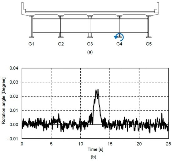 The displacement response in Figure 7 and the rotation angle response in Figure 8b showed similar shapes, particularly around the 12 s mark. In addition, it can be seen that when the bridge displacement response in Figure 7 is vibrating about the zero-axis, the bridge rotation angle in Figure 8b is also rotating about the zero-axis. In other words, it is thought that when no vehicle is traveling on the bridge, the bridge rotation angle is rotating about the zero-axis.