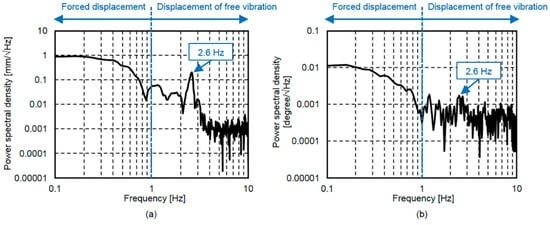 The displacement response spectrum in Figure 9a and the rotation angle response spectrum in Figure 9b also show similar shapes, particularly at the frequencies below 1.0 Hz, which is due to forced displacement. As can be seen in Figure 9a, the displacement response spectrum shows a natural vibration frequency at 2.6 Hz. In addition, while the rotation angle response spectrum peak shown in Figure 9b is not as well-defined, it also shows a 2.6 Hz natural vibration frequency. In the frequency range of 4 Hz to 10 Hz, neither spectrum shows other well-defined higher order mode peaks that depend on vibration. Therefore, it can be said that, based on our comparison between the displacement and rotation angle response spectra, as with the displacement response [21], the rotation angle response is largely classified into forced displacement and free vibration displacement responses.