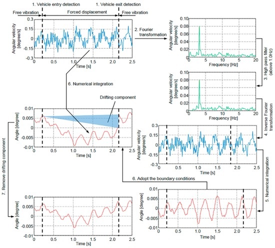 - The angular velocity in the frequency domain, which does not have the effect of forced displacement during vehicular passage, is transformed to the time domain through an inverse Fourier transform.