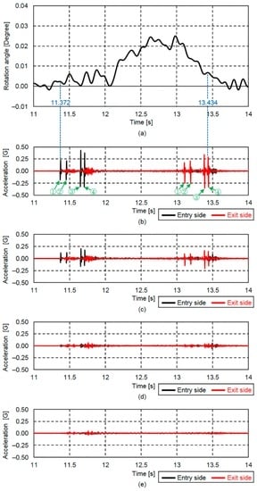 The acceleration record in Figure 11b revealed that the passage of a four-axle vehicle with an entry time of 11.372 s and an exit time of 13.434 s. It can be seen that the rotation angle response in Figure 11a starts to increase at the vehicle entry time (11.372 s). Furthermore, since the G2 acceleration response for the entry and exit sides showed the highest value, and the acceleration G3 response value for the entry and exit sides showed the second highest value, the four-axle vehicle could be presumed to be traveling on Lane 1 (see Figure 3c).