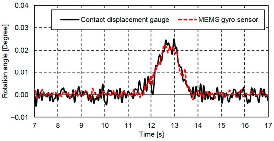 The rotation angle response determined from the MEMS IMU and that determined by the two contact displacement gauges also placed at G4 are shown in Figure 12, where it can been seen that both responses start to increase at the vehicle entry time (11.372 s) and both lines show similar shapes. Based on these results, the proposed method was found to be highly accurate when compared with the reference rotation angle response produced using the two contact displacement gauges.