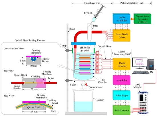 The experimental setup of the proposed optical-fiber PWM pH-sensing system is shown in Figure 4 and consists of three units: a pulse modulation unit, an optical-fiber pH sensor array used as a transducer unit, and a signal processing unit. We designed the pulse modulation unit and the signal processing unit using low-cost and easily available components from local electronics suppliers.
