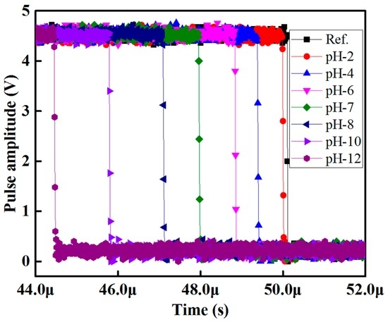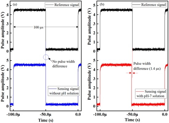 The waveform response of the proposed optical-fiber PWM pH-sensing system is shown in Figure 5a. There were no pulse-width differences between the reference and sensing signals when there was no buffer solution in the test chamber. However, when we injected a buffer solution into the test chamber, the pulse width of the received sensing signal decreased. As a result, the relative pulse width between the sensing and the reference signals increased. This is shown in Figure 5b. The relative pulse-width difference of the buffer solution at pH 7 for methyl red, which contained an optical-fiber sensing element of the array, is about 1.4 µs. We also observed the response of the proposed PWM sensing system after removing the buffer solution of pH 7 and we found that as the buffer solution is removed from the test chamber the pulse width of the received sensing returns to its original state in less than 12 s and we observed that there is no pulse width difference between the sensing and the reference signal after removing the buffer solution from the test chamber. This result indicates that the sensing performance of the designed signal processing unit is excellent, and that it has the ability to detect small differences in the pulse width.