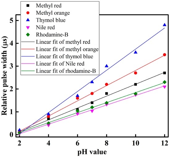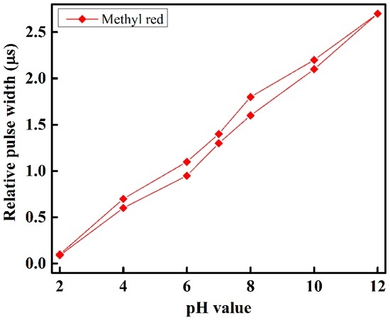 The pulse-width differences between the sensing signal and the reference signal in a buffer solution of pH 2 to 12 for methyl red containing optical-fiber sensing element S1 of the array is shown in Figure 6. In Figure 6, it is seen that the relative pulse width increases as the pH-value of the buffer solution increases.